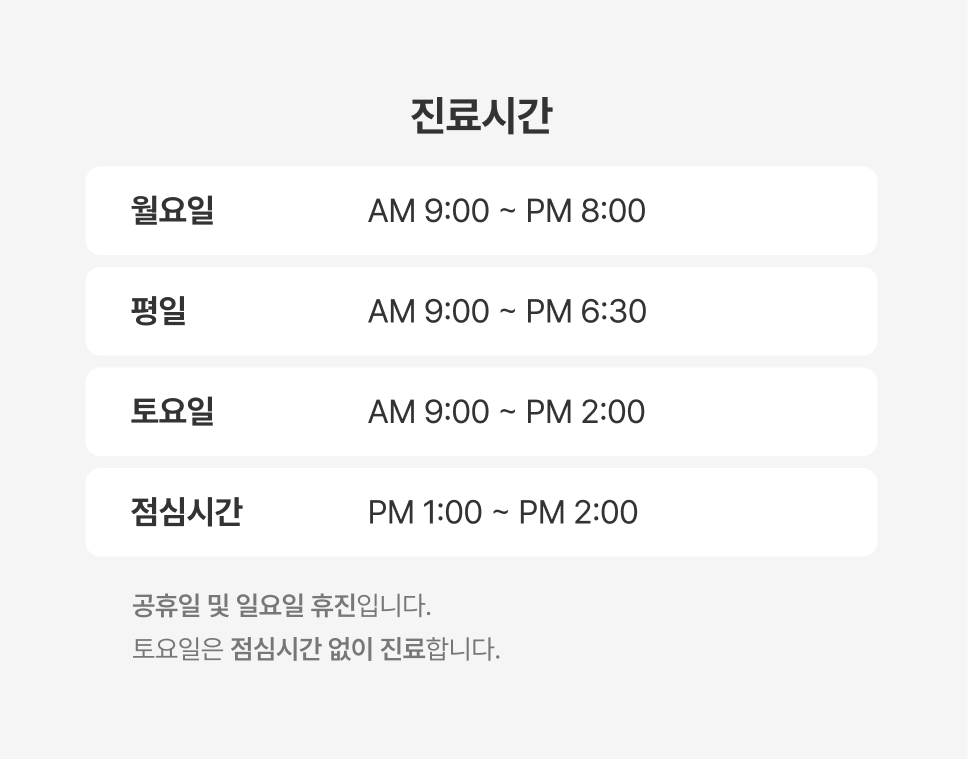 공휴일 및 일요일 휴진입니다.토요일은 점심시간 없이 진료합니다.
