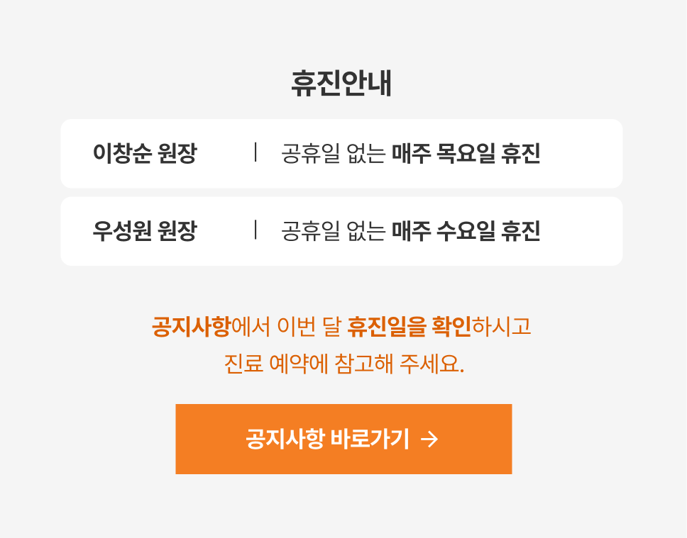 공지사항에서 이번 달 휴진일을 확인하시고 진료 예약에 참고해 주세요.