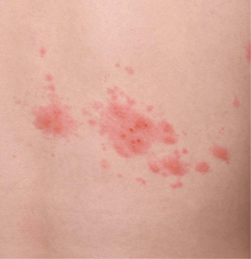 붉은 반점과 수포 형태 발진